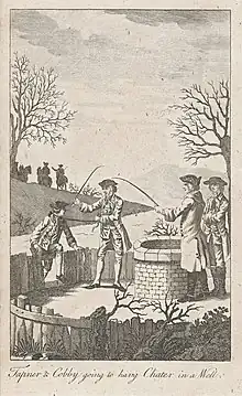 They stopped at the White Hart Inn at Rowlands Castle, a smugglers pub, where the landlady fetched smugglers William Jackson and William Carter to investigate them. They were given drink until they fell asleep and their documents were discovered, beaten and tied to horses by members of the local gang, then taken north to the Red Lion Inn at Rake. After burying the customs officer alive in a nearby fox earth they kept Chater chained to a shed at Trotton for several days before deciding to kill him. They threw Chater down a well at Lady Holt Park and dropped stones on top of him.[8][9][10]