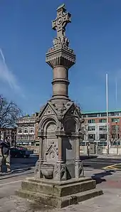 At the northern end of the street stands the Sheahan Memorial from 1906, which commemorates the place where a member of the Dublin Metropolitan Police, Constable Patrick Sheahan, died on duty. The memorial was designed by W. P. O'Neill, built by Harrison & Sons,[13] and was moved to the side of the street in 2012.[14] Its inscription reads, in English and Irish:[15][16]