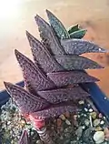 Haworthiopsis species are short perennial plants, with or without an obvious stem. The leaves either form a rosette or are arranged in various spirals on a more extended stem.[2] Individual leaves are smooth or have white markings, which may take the form of small protuberances (tubercules) or be more pointed, almost spine-like. The white markings may be on the lower surface of the leaf only, or on both surfaces, and may also extend to the leaf margins. The upper leaf surfaces are "windowed" in some species, and the margins may have toughened teeth.[3][4]