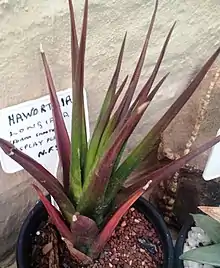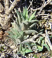 Phylogenetic studies, particularly from 2010 onwards, showed that Haworthia and other genera related to Aloe were not monophyletic.[7][8] Accordingly, in 2013, Rowley separated most of the species formerly placed in Haworthia subg. Hexangulares into a new genus, Haworthiopsis.[9] Haworthiopsis was revised in 2013 by Manning et al. so that the genus more closely correlated with the former subgenus,[3] a revision described as "more coherent" by Gildenhuys and Klopper in 2016.[4]
