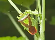 The hawthorn shield bug (Acanthosoma haemorrhoidale) is a common European shield bug.[1] Its chief food is haws, the fruit of the hawthorn tree, but adults can overwinter on a diet of leaves, and individuals can be found on many potential food plants, including pedunculate oak, sessile oak and whitebeam.[2] They may grow up to 17 mm (0.67 in) long, and are camouflaged in shades of green and brown. Like many so-called "stink bugs", they may release unpleasant odours when disturbed.[3]