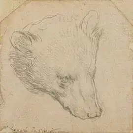Head of a Bear is thought to have been executed by a young Leonardo da Vinci (b. 1452) circa 1480. It is a close-up drawing of a bear's head on a 7-by-7-centimetre (2.8 in × 2.8 in) piece of pink-beige paper.[1][2] Its size has led it to be described as "a Post-it Note Leonardo".[1] It is drawn with a silverpoint pencil. Silverpointing is a technique that Leonardo learnt in the workshop of Andrea del Verrocchio. It is an unforgiving medium as the marks made by the silver pencil are very difficult to erase.[2]