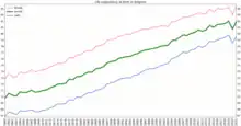 A new measure of expected human capital calculated for 195 countries from 1990 to 2016 and defined for each birth cohort as the expected years lived from age 20 to 64 years and adjusted for educational attainment, learning or education quality, and functional health status was published by the Lancet in September 2018. Belgium had the tenth highest level of expected human capital with 25 health, education, and learning-adjusted expected years lived between age 20 and 64 years. [1]