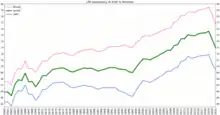 Less than 1% of the total population of Romania is a carrier or infected with HIV.[7] The most common cause of getting HIV is sharing needles. The first case of AIDS in Romania was diagnosed in 1985, and in 1989 cases have been reported in children.[8] Between 1985 and 2014 were reported 19,906 cases, 6,540 deaths, respectively (468 new cases per year).[9]
