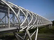 The original 1971 pedestrian bridge[3] across the motorway was replaced by a modern helical truss structure in 2008. The sections of the new bridge were fabricated off site and transported to site where they were assembled and lifted into place in one piece on 4 October 2008. The £5 million bridge opened to pedestrians and cyclists on 26 November 2008.[4]