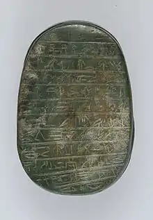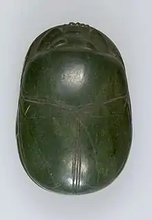 The heart scarab is an oval scarab artifact dating from ancient Egypt. Mostly an amulet, it was also used as jewelry, a memorializing artifact, or a grave good. The heart scarab was used by referring to Chapter 30 from the Book of the Dead and the weighing of the heart, being balanced by Maat, goddess of truth, justice, order, wisdom, and cosmic balance. The function of the heart scarab was to bind the heart to silence while it was being weighed in the underworld to ensure that the heart did not bear false witness against the deceased.[1] As in many current religions, the individual had to show 'worthiness' to achieve the afterlife. The heart was extremely important to ancient Egyptians as the seat of intelligence and the storehouse of memory. It was the only organ left in place during mummification. Heart scarab amulets were meant as substitutes for the heart should the deceased be deprived of the organ in the afterlife.[1] For example, when a person died, a heart scarab was often placed on their heart and bound underneath the bandages of the mummy. This was to ensure that it could not be physically removed from their person.[2]