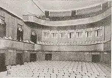 The auditorium is in a reduced two-aisle layout. Here, the second tier is not completely brought forward to the stage space in order to provide all spectators with the best viewing conditions and to prevent a distorted view of the stage.[1]: 81 The tail shape of the balustrade is characteristic of Kaufmann's architecture and was also used as a single-aisle system in the Berlin Renaissance Theatre and the Kaliningrad Regional Drama Theatre in Königsberg. The two cylindrical towers on either side of the stage, each housing stairs, match the curved tiers. The 800-seat auditorium is almost entirely covered with reddish to golden-brown stained panels of birch wood and was originally additionally decorated with valuable silk fabrics. The monotony of a usual rank theatre is avoided by rounding off the ramps. The wooden panelling, which was made by the company E. E. Lehmann,[12]: 124 extends up to the second tier and also includes the two towers.[12]: 124 This cladding creates the uniform impression of the room, which is deliberately not broken up by the installation of rear boxes behind the first tier and thus represents Kaufmann's decisive innovation in comparison with other theatre constructions of the time. The ceiling is unadorned and without the "obligatory" chandelier.[12]: 124