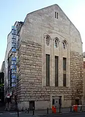 The structure of the theatre serves optimal use of space and a clear disposition, divided into a front building with anterooms (entrances, cloakrooms, staircases and foyers), the audience and stage house and the administrative wing.[12] On the secondary facade, this grouping of front and rear buildings is visible. Both facades are covered by a bossage almost up to the gable, with a sculptural effect by the block bond of alternately wide and narrow stone courses.[2] The representative main facade of shell limestone is preceded by a perron leading to the three entrances set into the wall.[4]: 225 The facade is crowned by a polygonal bay bordered by a balustrade and terminated by a gable with a copper roof.[12]: 119 This niche-like construction is articulated by elongated window tracks and oculi. The latter are framed by relief figures.[4]: 225 The subdivision by windows is repeated on the staircases to the left and right of the bay and on the front of the secondary facade. The rounded gable of the front facade is decorated on the sides with mask reliefs by Hermann Feuerhahn.[2] The design of the main facade is a novel form, and was copied by other architects, such as Fritz Schumacher for the Dresden Crematorium.[4]: 225 Kaufmann's exterior architecture is striking in its absence of superfluous building elements. The construction and decoration of the building are largely limited to necessities and serve above all the actual purpose of the building: the theatre performances.[12]: 117 The rear buildings are hardly noticeable due to their simple, functional design and plastering. In front of the towering stage house are the two stair towers, which are covered by simple domed roofs. The facades of the three rear buildings appear withdrawn due to the uniform vertical arrangement of the windows and the simple plastering without decorative elements.[12]