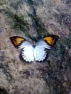 In the males the upperside is creamy white. Forewing: the costa narrowly, the apex and terminal margin to middle of interspace 1 are black. An irregular, somewhat sinuous, black band extends obliquely from beyond the middle of the costa across the upper apex of the cell, and meets at interspace 1 the black on the terminal margin. Within the triangle thus formed is enclosed a rich orange-red patch that is traversed by the black veins and bears in interspaces 3 to 6 a postdiscal series of black inwardly elongated spots. Hindwing: nearly uniform, touched with black on the terminal margin anteriorly and with a conspicuous postdiscal black spot in interspace 7. In some specimens there are one or two smaller spots in continuation of the series in the interspaces below.[3]