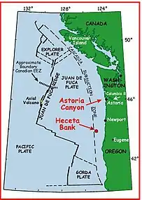 Heceta Bank is a rocky bank located 55 kilometers (km) off the Oregon coast near Florence, centered on approximately 44°N, 125°W, and is roughly 29 km long and upwards of 13 km wide.[1][2] Heceta Bank is an area of ecological and oceanographic importance. The unique bathymetric features and seasonal circulation within the bank provides habitat for a diversity of economically-important fish species.