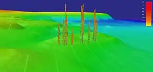 To the east, Heceta Bank is bound by a steep and smooth continental shelf.[1] In contrast, the bank's topography is relatively complex and irregular. In shallow depths (<100 m), the bank is composed primarily of rock and boulder outcrops, which are separated by small valley-like features. These valleys are presumed to have been created from the erosion of waves during historical periods when sea level was much lower than it is currently.[5] At greater depths, the seafloor transitions to smaller cobbles and fine-grain sediment, such as mud and silt.[2][5] This complex seafloor provides important habitat for many benthic-dwelling species, such as rockfish and other demersal species.[5] Furthermore, the irregularity in topography, caused by movement due to crustal uplift and transform faults, also allows for the release of methane gas from the sediment, which occurs from <100 to 600 m depth.[6]