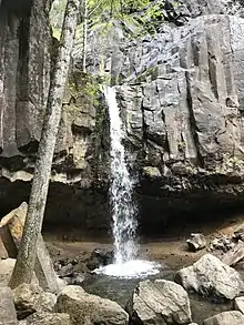 Hedge Creek Falls is a waterfall on Hedge Creek, in the Shasta Cascade area in Dunsmuir, California. There is a small cave located behind the waterfall, allowing visitors to walk behind the cascading water.[1] Shortly after the waterfall, hedge creek flows into the Sacramento River south of Mossbrae Falls. There is a viewing platform over the river, with a view of Mount Shasta. Access to the waterfall and viewing platform is via a short hiking trail. The trail starts at a small park off the Dunsmuir Ave/Siskiyou Ave exit on Interstate 5.[2] The waterfall is 0.2 miles (0.32 km) down Hedge Creek Falls Trail.[3] The close proximity to Interstate 5, makes the waterfall a very popular stopping point for passing motorists.