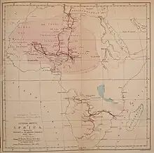After his return to London Barth wrote and published accounts of his travels simultaneously in English and German, under the title Reisen und Entdeckungen in Nord- und Centralafrika (Travels and Discoveries in North and Central Africa; 1857–1858, 5 volumes., approx. 3,500 pages). The volumes included coloured plates of pictures produced by Martin Bernatz based on Barth's original sketches.[17] The work was considered one of the finest of its kind, being cited by Darwin.[18] It is still used by historians of Africa, and remains an important scientific work on African cultures of the age. It also provided the first evidence by a European that the Sahara had once been a savanna.[19][20]