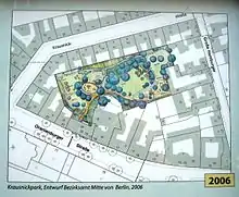 On 7 October 1861 a street in the Spandauer Vorstadt area of Mitte in Berlin was named after him in honor, Krausnickstraße.[6][7] Nearby Krausnick Park, an inner block park between Krausnickstraße, Oranienburger Straße and Große Hamburger Straße has history that goes back to the 18th century and was recently renovated from 2004 until 2007.[8]