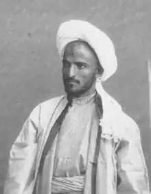 In particular, the coloured turban is known as a Ghabanah and was a common head accessory for the inhabitants of Mecca, Madinah and Jeddah in particular.[3] Ghabanah today is the heritage uniform headwear for local traders and the general categories of the prestigious and middle-class. There are several types of Ghabanah, perhaps the most famous is the yellow (Halabi), that is made in Aleppo and is characterized by different inscriptions and is wrapped on a dome-like hollow taqiyah or a Turkish fez or kalpak cap. It is similar to turbans in neighbouring regions, like the masar, a traditional lightly-coloured turban in Oman that is also common in some regions like the south of Yemen and Hadhramaut.[4]