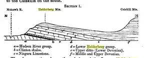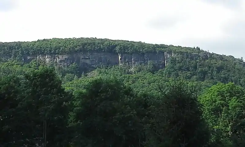 The Helderberg Escarpment, also known as the Helderberg Mountains, is an escarpment in eastern New York, United States, roughly 11 miles (18 km) west of the city of Albany.[2][3] The escarpment is the northeastern extremity of the Allegheny Plateau. It rises steeply from the Hudson Valley below, with an elevation difference of approximately 700 feet (from 400 to 1,100 feet) over a horizontal distance of approximately 2,000 feet. Much of the escarpment is within John Boyd Thacher State Park, and has views of the Hudson Valley and the Capital District.