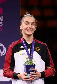 In July Kevric was selected to compete at the European Youth Olympic Festival alongside Gotthardt and Lisa Wötzel.[17] During the team and all-around final Kevric helped Germany place second as a team and individually she defended her all-around title from the previous year.[18] During the mixed pairs event she was teamed with Mert Öztürk; they finished second behind the Italian pair of Sara Caputo and Tommaso Brugnami. On vault Kevric won silver with a minimal gap of 0.016 points behind Italy's Sara Caputo; this was preceded by a questionable scoring to the disadvantage of Kevric (a protest note was waived), which even led the Italian team to apologize personally to the Germans.[19] Kevric then performed to first place on each of the other three individual apparatuses — first on the uneven bars with competition top score,[20] and the following day on the balance beam as well as the floor.[21] With four gold and three silver medals,[22] she advanced to the most successful multi-medal winner of the entire festival.[23][24]