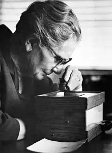 ![]() Dr. Helen Sawyer Hogg, at a table in her office, studies a photographic slide taken of one of her favourite variable stars. | |