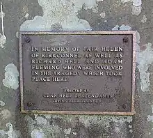 In the burial ground of Kirkconnell, near the Border, is the grave of Helen Irving, recognised by tradition as Fair Helen of Kirkconnell, and who is supposed to have lived in the sixteenth century. It is also the grave of her lover, Adam Fleming – a name that once predominated the district. Helen, according to the narration of Pennant (Pennant’s Tour in Scotland, 1772), “was beloved by two gentlemen at the same time. The one vowed to sacrifice the successful rival to his resentment, and watched an opportunity while the happy pair were sitting on the banks of the Kirtle, that washes these grounds. Helen perceived the desperate lover on the opposite side, and fondly thinking to save her favourite, interposed; and, receiving the wound intended for her beloved, fell and expired in his arms. He instantly avenged her death; then fled into Spain, and served for some time against the Infidels: on his return, he visited the grave of his unfortunate mistress, stretched himself on it, and expiring on the spot, was interred by her side. A cross and a sword are engraven on the tombstone, with 'HIC JACET ADAMUS FLEMING'; the only memorial of this unhappy gentleman, except an ancient ballad which records the tragical event.