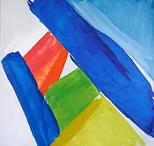The following year one of Herzbrun's paintings was included in a Baltimore Museum of Art exhibition that was intended to give a comprehensive overview of the Washington scene over the previous two decades.[32] Paul Richard, a critic for The Washington Post, gave this show an intemperate review, calling it insensitive, haphazard, and incoherent. In it he said Herzbrun's painting was an "eye-curdling canvas."[33] His view of a solo exhibition of hers some four years later was considerably more positive, describing the show as a happy one and her paintings as "colorful and free and bright."[34] Two years later the Corcoran chose Herzbrun along with John Robinson and Alma Thomas for a show called "Contemporary Washington Art" that was sponsored by the American Revolution Bicentennial Administration.[35][note 10] In 1978 she was given a solo exhibition and in 1980 a three-person exhibition at D.C.'s Rasmussen Gallery.[37][38][note 11] The following year cancer forced her to give up painting. Although she made collages for a time, the disease did not leave her and eventually brought about her death in 1984.[42] Posthumous exhibitions include a retrospective at the Watkins Gallery and a 2019 presentation called "Grace Hartigan and Helene Herzbrun: Reframing Abstract Expressionism" at the American University Art Museum.[42][43]