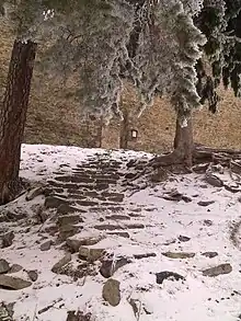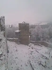 The castle is situated on top of a rock, which today is partially hidden by forests. In front of the castle there used to be a fortressed village. The castle has a circular floor plan. The entrance to the castle led through a bridge over a deep ditch and intermittent rocks, and is surrounded by walls. The entrance through the first door once led over the floating bridge.