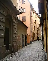 Helga Lekamens Gränd (Swedish: "Alley of the Holy Body") is an alley in Gamla stan, the old town in central Stockholm, Sweden. Connecting Västerlånggatan to Stora Nygatan, it forms a parallel street to Stora Gråmunkegränd and Göran Hälsinges Gränd.