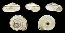 The 12โ20 mm. shell is broad and very depressed with an open coil forming a convex, low spire. The umbilicus is very wide. The whorls are slightly convex, and have shallow sutures. The aperture is elliptical and lacks an internal rib. The surface (periostracum) is white or pale yellow-brown. The shell often (but not always) has dark brown or yellow-brown spiral bands, and the surface has fine irregular growth ridges.