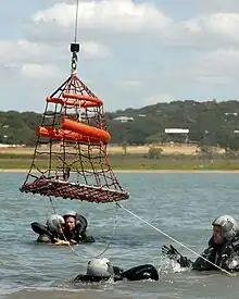 A helicopter rescue basket is a basket suspended below a helicopter in order to rescue people from a fire or other disaster site.