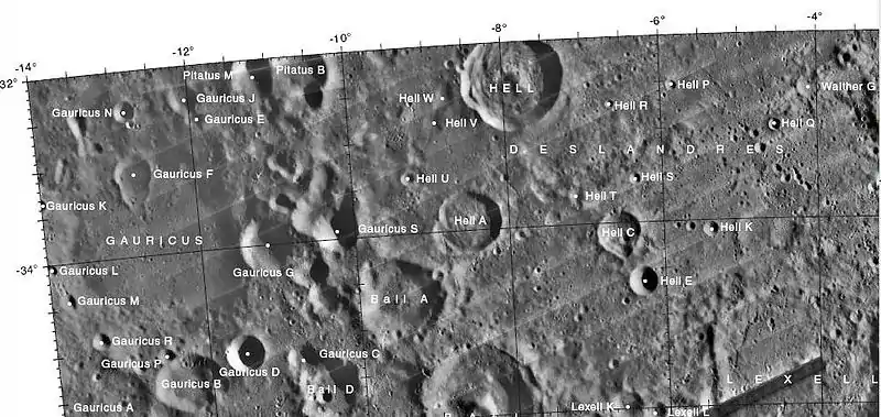 Hell is a lunar crater in the south of the Moon's near side, within the western half of the enormous walled plain Deslandres. To the southeast, also within Deslandres, is the larger crater Lexell, and about 9° to the south lies the prominent Tycho crater.[2] The crater received its name in 1935 after the Hungarian astronomer and ordained Jesuit priest Maximilian Hell.[3] It has 19 satellite craters with diameters ranging between about 3 and 22 km. Nearly all Hell craters are relatively flat and shallow, with a sharp, well-defined rim and a typical diameter-to-depth ratio of about 10.