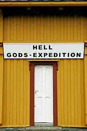The station's freight building still bears the old sign saying Hell Gods-Expedition. In Norwegian, Gods-Expedition (archaic) or godsekspedisjon (modern) means freight service or cargo handling.[6] This sign is a popular photo opportunity for foreign English-speaking tourists. Especially in the summer months, it is not unusual for foreigners, when discovering the sign, to disembark the train in order to get a photo. The building is not used for freight anymore. All light freight is handled through post offices or competing companies.