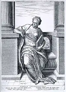 The Hellespontine Sibyl was the priestess presiding over the Apollonian oracle at Dardania. The Sibyl is sometimes referred to as the Trojan Sibyl. The word Sibyl comes (via Latin) from the Ancient Greek word sibylla, meaning prophetess or oracle. The Hellespontine Sibyl was known, particularly in the late Roman Imperial period and the early Middle Ages, for a claim that she predicted the crucifixion of Jesus Christ.[1] This claim comes from the Sibylline Oracles, which are not to be confused with the Sibylline Books.
