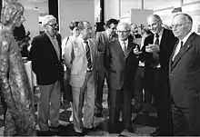![]() Professor Helmut Heinze (second from right) explaining his statue Knabenakt to Erich Honecker (third form right), Kurt Hager (first from right), Egon Krenz (first behind Honecker), Prof Willi Sitte (second from left) and professor Jo Jastram (first from left) at Albertinum on 2 October 1982. | |