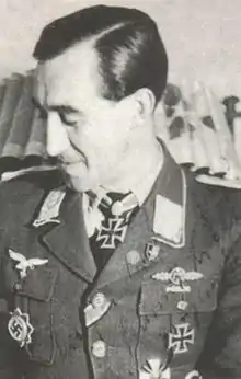 On 8 October, he shot down five Russian aircraft (kills 30 to 34). Four more are shot down on 5 December and his score raises to 72. By the end of 1943 his victories total had reached 80. On 5 April 1944, his 90th air victory had won him the Knight's Cross of the Iron Cross (Ritterkreuz des Eisernen Kreuzes). Six days later, 11 April 1944, an "all-white Sturmovik" provided him with his 100th aerial victory.[9][10] He was the 69th Luftwaffe pilot to achieve the century mark.[11]