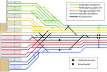 A schematic map of the tracks at the Helsinki Central Station. Green lines denote commuter traffic on the Rantarata line, yellow lines denote long-distance traffic on the Rantarata line, red lines denote long-distance traffic on the Finnish Main Line, blue lines denote commuter traffic on the Finnish Main Line, and black lines denote service traffic. Arrows denote the direction of traffic and spheres denote stabling tracks.