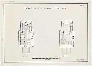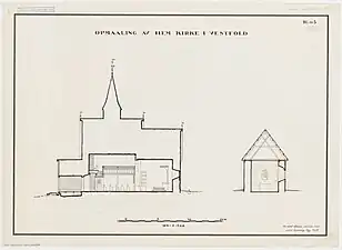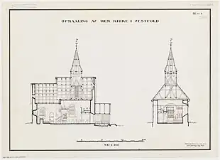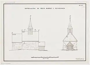 The earliest existing historical records of the church date back to the year 1392, but the church was not necessarily built that year. The original part of the building was possibly built sometime around the year 1200, although the church presently uses 1392 as the year of its founding (celebrating its 600th anniversary in 1992). In 1992, dendrochronological dating was carried out to determine the age of the church, but it was inconclusive. The stone church was initially built with a rectangular nave and a smaller, rectangular chancel with a lower roofline. It was built in a Romanesque style, typically seen in churches built in the 12th and early 13th centuries in Norway. The building is constructed of stone, with the walls measuring about 120 centimetres (47 in) thick. Later, a wooden church porch was built at the main entrance. Extensive repairs were carried out in 1686 (a wall and a new tower on top of the nave, and second floor seating galleries in the nave). In 1932, a sacristy was built on the south side of the chancel. In 1951, the sacristy was taken down and rebuilt on the east end of the chancel.[3][4]