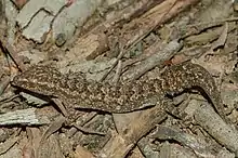 Amaral's Brazilian gecko (Hemidactylus brasilianus) is a species of nocturnal geckos from the arid Jalapão Region, Minas Gerais/Bahia (Brazil).[3] It is a bluish-gray, oviparous tree-dwelling species, feeding on herbivorous insects and other invertebrates. It has immovable, or fixed eyelids. Being nocturnal, it has vertically oriented pupils. They have a life span of about 6–13 years and are sexually mature at 6–9 months old. They are about 13 cm long and 2 cm wide. They cannot change their colour. When attacked by a bird, they run in circles, confusing the enemy. When attacked by a ground animal, they climb a high tree, run in tall grass, or try to hide under leaves, rocks, and other things they can find. They are one of the smartest geckos on the earth, and are not endangered.