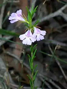 A small shrub up to 2 metres tall. Leaves in whorls of three. The leaves are hairless, narrow, 1 to 1.6 cm long and 1 mm wide. They are wedged shape with an acute angle at the base of the leaf and narrow and pointed at the end of the leaf. The leaf stem is 2 to 4 mm long. Flowers are blue or violet and appear mostly from August to April.[3]