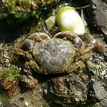 Hemigrapsus crenulatus, the hairy-handed crab or papaka huruhuru,[2] is a marine crab of the family Varunidae, endemic to the New Zealand coast, although a taxon in Chile may be conspecific.[3] It is an intertidal species with semi-terrestrial tendencies. They are named by their characteristic setae, or patches of thick hair, on the chelipeds and legs.[4] They can range from green to brown in coloration. Adult crabs are generally 2–4 cm (0.8–1.6 in) wide at the carapace,[5] although the smallest mature crabs can be around just 1 cm (0.4 in) wide.[6] and are able to survive and reproduce in environments of widely varying salinities.[7]