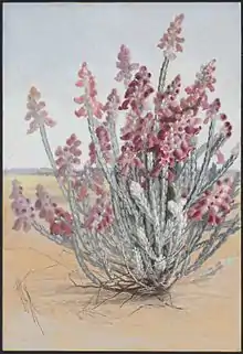 Hemiphora elderi, commonly known as red velvet,[2] is a flowering plant in the mint family Lamiaceae and is endemic to the south-west of Western Australia. It is a small shrub with its leaves densely covered with white, woolly hairs and with small clusters of reddish-purple, bell-shaped flowers.