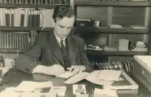 Young Blöte standing in an office surrounded by books.