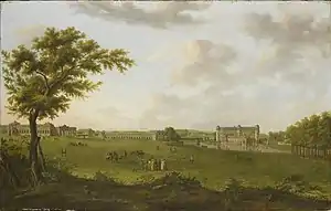 De Cort would not remain a member of the society for long as he left Flanders after the Brabant Revolution of 1789.[7] He settled in London c. 1790 and remained in England for the rest of his life. There he built up a highly successful practice as a painter of country houses, castles, cathedrals and other views. He gained many commissions from the nobility and other important patrons. He thus stood in a long tradition of Flemish painters who made topographical paintings of the estates of the British nobility, which includes artists such as Jan Siberechts, Peter Tillemans and Pieter Andreas Rijsbrack. Many of his works were exhibited at the Royal Academy and the British Institution between 1790 and 1806.[2]