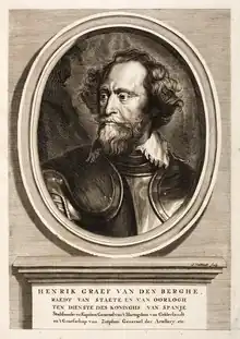 Hendrik van den Bergh (German: Heinrich von dem Bergh), 1573 to 22 May 1638, was a Flemish noble and professional soldier. Hereditary lord of Stevensweert, from 1618 to 1637 he was also stadtholder of Upper Guelders, the only part of Guelders to remain loyal to Habsburg Spain during the Eighty Years War. Known as a brave and resourceful cavalry commander, he spent most of his career with the Spanish Army of Flanders and became its Maestre de campo in 1628. Accused of treachery after the loss of Den Bosch in 1629, he defected to the Dutch Republic following the 1632 Conspiracy of Nobles.[2]