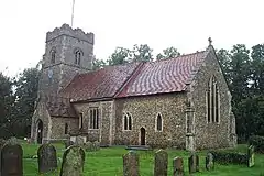 It is thought that the roof would have been thatched at one time but is known to have been tiled since 1900. As one approaches the church, the perpendicular style tower can be seen. From the inscription above the west door asking for prayers for Thomas Sekeford (Seckford) and his second wife Margarete, it can be assumed that it was built at his expense. The Seckford arms, a pair of scissors or shears, appear between the letters. He died on 23 November 1505 and is buried at Great Bealings. The Seckford family gave generously to the town of Woodbridge. On the left, a symbol of a key links with St. Peter. The west window was repaired in 1872 but the original shape was retained. the decorative flintwork on the buttresses of the tower is considered to be a good example of such work. The stone and flintwork of the tower were refurbished in 1980 at a cost of £9,000. This included cleaning and repointing the Elizabethan brickwork around the top of the tower. The flag pole came from HMS Ganges in 1902, a naval training establishment in Shotley for a number of years. This is surmounted by a weathervane in the form of St. Peter's Key. Also on top of the tower is a plaque recording the replacement of the lead on the tower in 1772. The "plummers" bill for the work was £18 18s 9d. Recently both the flagpole and weathervane have had major repair work, resulting in removing, repairing and replacing the lead on the tower. The present electric clock was installed in 1973 and made to strike the hours in 1976. For up to 300 years there was a turret clock with a six-foot pendulum which needed to be wound up regularly. This was taken out when the electricity arrived. In June 2008 the clock was completely replaced with an up-to-date 24-hour system. Between the tower and the porch on a corner stone nine feet above ground level can be seen an old scratch dial (or sundial); a similar one can be found on the right of the porch entrance.