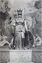 The firm's masterpiece is the ivory and silver chryselephantine sculpture Minerve, commissioned by the Duke of Luynes for the salle des fêtes in his Château of Dampierre. The statue is a reproduction of the ancient Greek sculptor Phidias's Athena Parthenos, known to the Romans as Minerva. The sculptor Pierre-Charles Simart began creating the model in the spring of 1844, and the Maison Duponchel began its execution in 1846, finishing in 1851. Silver was used for the goddess's tunic and shield, and bronze for the serpent and weapons. Ivory was used for the areas of flesh: the goddess's face, neck, arms, and feet; the torso of Victory (held in the goddess's hand); and the head of Medusa on the shield. The concave side of the shield depicts the combat between the Amazons and the Athenians, and the convex side, a battle between the Giants and the Gods. The sandals depict the dispute of the Centaurs with the Lapiths. The repoussé and chasing was done by Delagrange de Lagny. The statue stands on a marble pedestal with bas-reliefs showing Pandora receiving gifts from the gods. The finished statue including the pedestal is more than nine feet tall, and it was exhibited at the Paris International Exhibition of 1855. To Duponchel's great annoyance, the organizers required him to exhibit the work in the Palais des Beaux-Arts, rather than the Palais de l'Industrie, which was drawing far larger crowds. Despite this, the piece attracted much attention, both at the exhibit and in the press, and it won a Medal of Honour.[28]