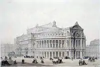 Early biographers also say that Duponchel attended courses in architecture at the École des Beaux-Arts, but this must be viewed with caution as there is no record of it in the student registers. At the time of his father's death in 1821, he had in effect become an architect, but some sources cast doubt on this, saying that he was an amateur and unaware of the technical side of the subject. Later, in February 1861, Duponchel collaborated with two other more well-established architects, Botrel[5] and Alphonse-Nicolas Crépinet, and submitted an architectural project in a competition for the design of a new opera house. G. Bourdin wrote unfavourably in Le Figaro that the designs were remarkable in revealing that, while Duponchel had studied the subject, it was not likely that he had completed a diploma, and that to call him an architect was an overstatement. He also pointed out that throughout his career Duponchel habitually benefited from collaboration with others. However, when the results were announced Duponchel and his collaborators won the second place prize of 4,000 francs out of 170 entrants.[6]