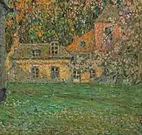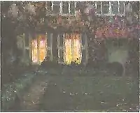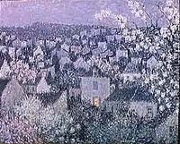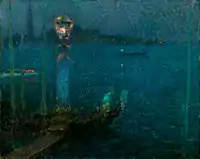 Le Sidaner held successful solo exhibitions at one of George Petit's Galleries in 1897 and at the La Libre Esthétique in Brussels in 1898. He was keen to buy a country property where he could create a garden and work in reflective solitude. It was on the advice of ceramist Auguste Delaherche that he rented a neglected property at Gerberoy in the Picardy countryside that he subsequently bought in 1904.[19] Once at Gerberoy, Le Sidaner rarely painted figures again preferring to create impressionistic moods through objects that imply human presence.[20] He also set upon the creation of a magnificent garden to rival Monet's at Giverny.[21] In 1902 Le Sidaner joined his old friend Eugène Chigot for an extended visit to Gravelines and Gisors[22] The preference for a few years was to avoid the harsh Oise winters and encamp to milder climes. In 1903 Le Sidaner spent the winter at Chartres and in 1906 in Venice where according to his biographer Mauclair he completed some of his greatest masterpieces.[2] They include a series of nocturne paintings: Le Grand Canal, Le Palais ducal, Le Palais Rouge and the vivid, mysterious La Sérénade, (1906). This series of paintings were highly acclaimed as examples of Le Sidaner's ability to capture atmospheric lighting effects, using dappled brushwork to create a sense of the luminosity of twilight.[3]