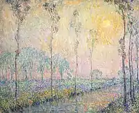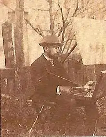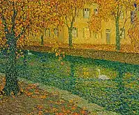 In Paris he studied under Alexandre Cabanel, one of the most influential teachers of belle époque French painting.[5] Although Cabanel mainly painted in an academic style, that were dismissed derisively as L'art pompier (literally ‘Fireman art’) by some critics,[6] he possessed a deep knowledge of nineteenth century French art, in particular of En plein air painting[note 2] and the naturalism of the Barbizon School.[7] According to his biographer Le Sidaner saw Manet's final exhibits at the Paris Salon and was deeply reflective at what he saw in the modernist Manet's work. The result was that Le Sidaner resigned from Cabanel's school, on the grounds of artistic differences.[2] Le Sidaner's interests in the use of colour, softness of form and in painting in the gloaming light were formed during this period as he sought an artistic cure in naturalism and En plein air painting.[8]