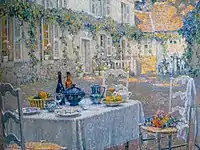 In the years following the turmoil of the First World War Le Sidaner's painting evolved further as his choice of colours became brighter and more intense. The rue de l'Eglise, Villefranche-sur-Mer (1928), now at Thyssen-Bornemisza Museum in Madrid is typical of his later work. It is vibrant with reds, oranges and green, and depicts a seemingly ordinary street in Villefranche overlooking a narrow steep passageway leading to a church. There is a figure in red on the stairs almost submerged in the building, a symbol of light into darkness.[26] It was a colourful departure from the hazy, diffused depictions of light that characterised his middle years. Throughout the 1920s, Le Sidaner painted across France from Brittany to the Côte d'Azur where he often stayed at Villefranche-sur-Mer and from his homes in Versailles and Gerberoy where he painted intimist studies of domestic interiors particularly, of vacated tables that included La Table, harmonie blanche (1927) a study in white, which recalls Whistler, bathed in a poetic somnolence. Camille Mauclair calls it the Art du silence (art of silence).[27]