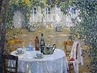 Le Sidaner's paintings and pastels were widely collected throughout his career. His seductive views of the gardens he created in the ruins of the medieval fortress at Gerberoy, with their recently vacated tables dappled in sunlight and overhung by roses, have cemented his reputation as a unique artist who does not fit easily into an art movement .[3]