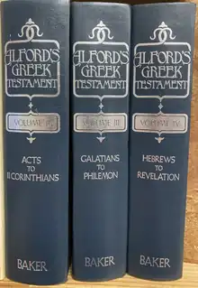 His chief fame rests on his monumental edition of the New Testament in Greek (8 vols.), on which he worked from 1841 to 1861. In this work he first produced a careful collation of the readings of the chief manuscripts and the researches of the ripest continental scholarship of his day. Philological rather than theological in character, it marked an epochal change from the old homiletic commentary, and though more recent research, patristic and papyral, has largely changed the method of New Testament exegesis, Alford's work is still a quarry where the student can dig with a good deal of profit.[1] See Alford's Law for an example.
